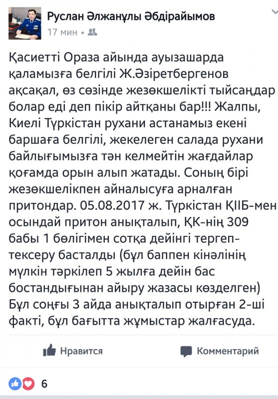 Скриншот со страницы прокурора Туркестана в Facebook.