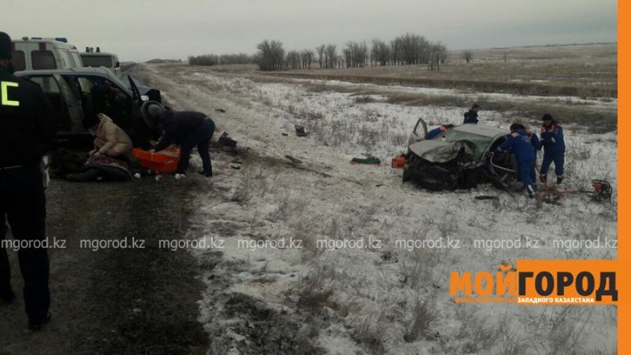 Столкновение автомобилей Volkswagen и KIA Rio привело к смерти четырех человек. "Две женщины, 49 и 56 лет, скончались на месте до приезда скорой помощи. Остальные пять человек были доставлены в Акжайыкскую ЦРБ. 54-летний мужчина с политравмам,и не совместимыми с жизнью, скончался в больнице. Санавиацией был организован выезд реаниматолога, нейрохирурга, травматолога и гинеколога. 55-летняя женщина была доставлена в коме, ей провели операцию, однако спасти ее не удалось", - рассказала заместитель управления здравоохранения области Гульнар Абдрахманова.