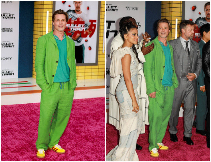 На новый кинопоказ Питт также оделся ярко. На этот раз актер выбрал для своего выхода сочный зеленый брючный костюм и яркие кеды.