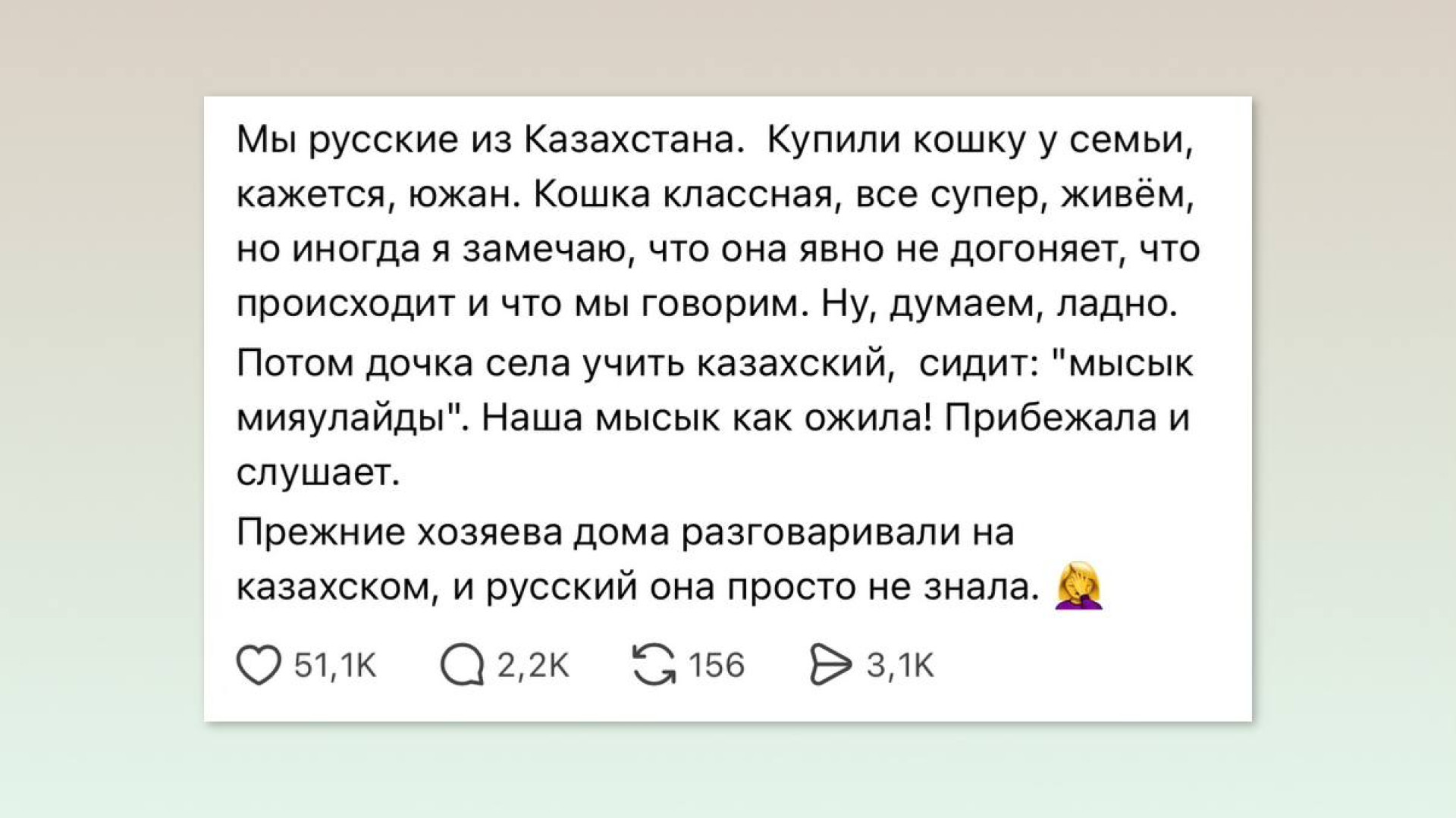 "Потом дочка села учить казахский, говорит: "мысық мияулайды". Наша мысық как ожила — прибежала и слушает. Прежние хозяева дома разговаривали на казахском, и русский она просто не знала", — написала автор.