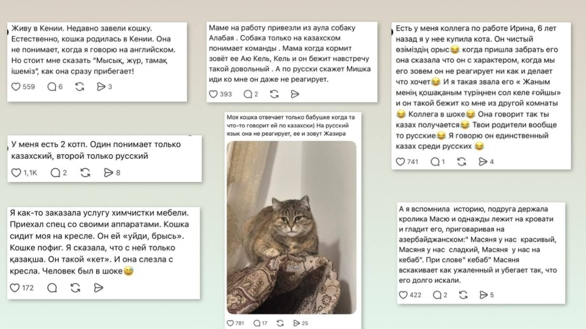 "Моя кошка отвечает только бабушке, когда та говорит с ней по-казахски. На русский не реагирует", "Живу в Кении. Завели кошку. На английский не реагирует, но стоит сказать: "Мысық, жүр, тамақ ішеміз" — сразу прибегает", "Купила кота у коллеги. Она говорила — с характером, не откликается. Я его позвала на казахском — и он прибежал. Коллега была в шоке", "Заказала химчистку. Специалист говорит кошке "брысь" — ноль реакции. Сказал "кет" — и она ушла. Он был в шоке", "У меня два кота: один понимает только казахский, второй — только русский", — рассказали комментаторы.