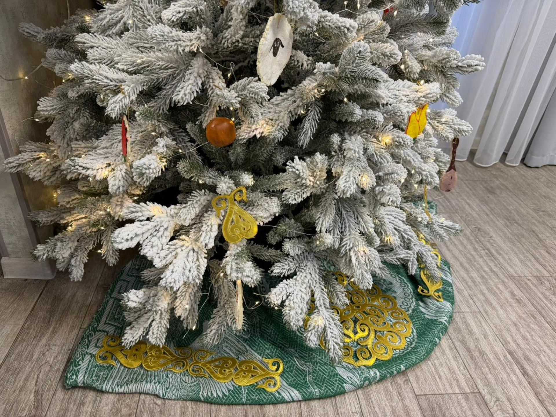 "Под елкой всегда имитируем снежок, но так как задача стояла сделать все в стиле Наурыза, решено было сделать корпе. Но сшить ее я не успела, поэтому взяла ткань и украсила орнаментами", — говорит Вера.