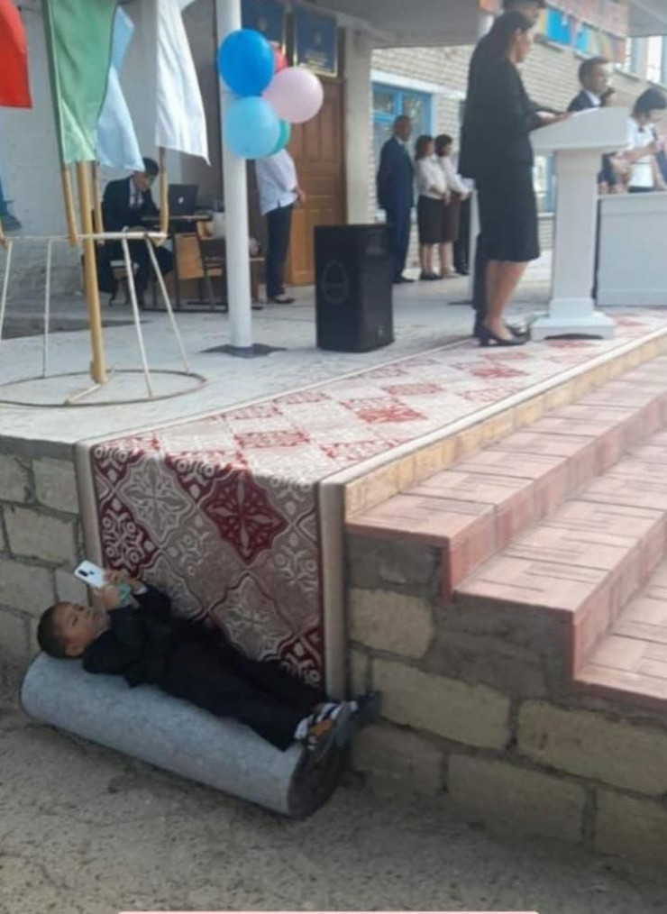Как рассказала мама мальчика Бакытгуль Жакупова, снимок сделал кто-то из присутствующих на торжественной линейке. На мероприятие малыш пришел за компанию: вместе с мамой, двумя старшими братьями и сестренкой, которые учатся в этой школе.