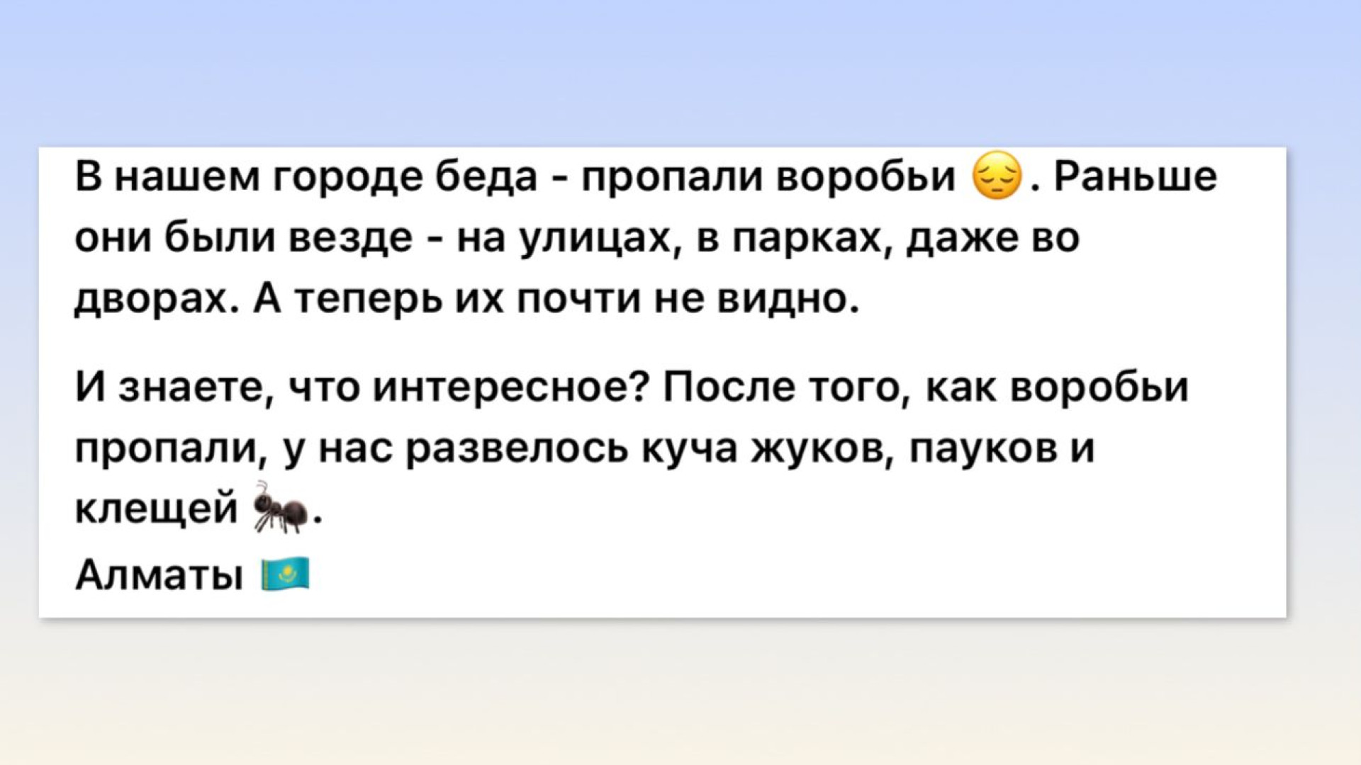 "В нашем городе беда: пропали воробьи. Раньше они были везде: на улицах, в парках, даже во дворах. А теперь их почти не видно. И знаете, что интересно? После того как воробьи исчезли, у нас развелось огромное количество насекомых: жуков, пауков и клещей", — отметил автор поста.