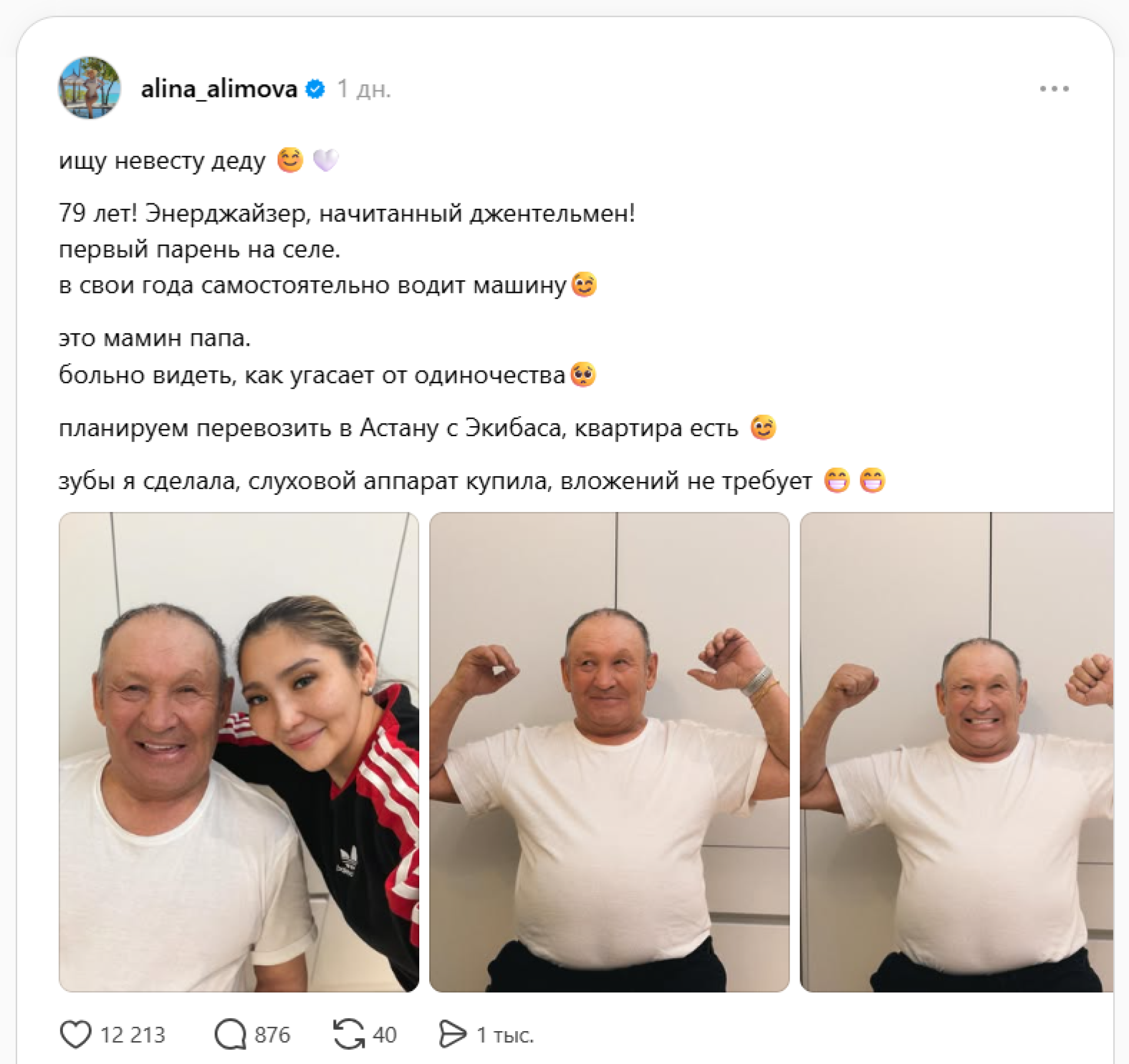 Запустила волну столичный стоматолог Алина Алимова. Все началось с приезда ее 79-летнего дедушки из Экибастуза в Астану. Мужчина долго отнекивался от поездки, придумывая разные причины, но в итоге признался внучке в самом сокровенном.