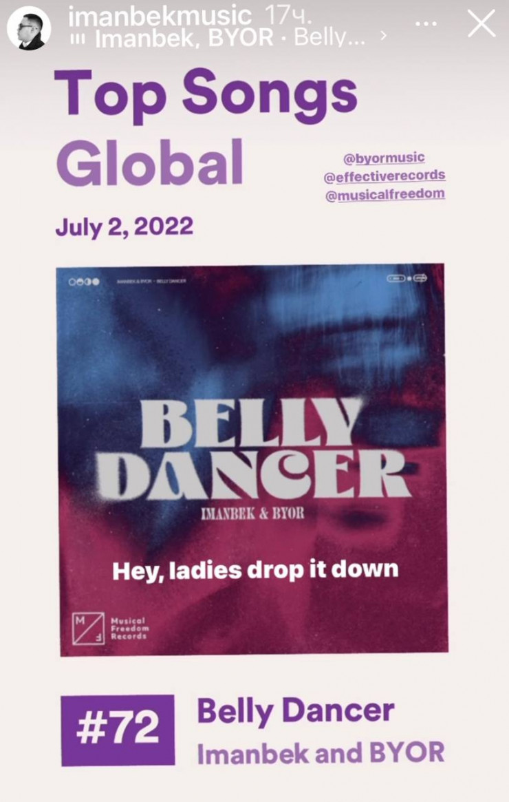 Отметим, что на своей странице в Instagram диджей Imanbek поделился в сторис позициями трека "Belly Dancer" в ежедневном чарте Spotify за 2 июля 2022 года. Композиция занимала 72-е место из 200.