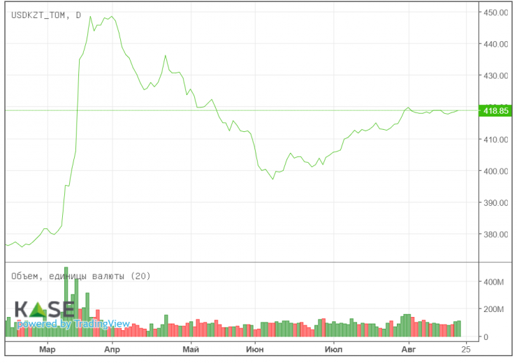 По данным сайта Ассоциации финансистов Казахстана, в концу прошлой недели пара USDKZT демонстрировала некоторую устойчивость несмотря на более существенную негативную динамику котировок нефти и ослабление российского рубля. По итогам валютных торгов в пятницу пара USDKZT закрылась на уровне 418,62 в сравнении с показателем в 418,37 днем ранее (+0,06 процента). При этом торги проходили при средней активности - совокупный объем торгов составил 116,3 миллиона долларов (+8,3 миллиона). Вместе с тем, по данным АФК, потенциальный рост объемов торгов на этой неделе может свидетельствовать о конвертации валютной выручки экспортерами за второй квартал текущего года.
