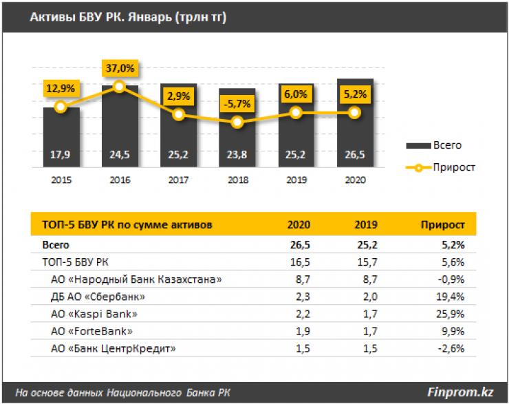 По итогам января 2020 года активы БВУ РК достигли 26,5 триллиона тенге, увеличившись на 5,2 процента за год. Это составляет 38,6 процента от ВВП страны.