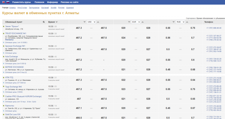 В Алматы же купить доллары и европейскую валюту можно. Некоторые обменники все же приостановили продажу долларов и евро. Курс доллара в алматинских обменниках на покупку составляет 467,3, а евро - 520-524, в то время как продают доллары по курсу 467,5 тенге, а евро - 528 тенге.