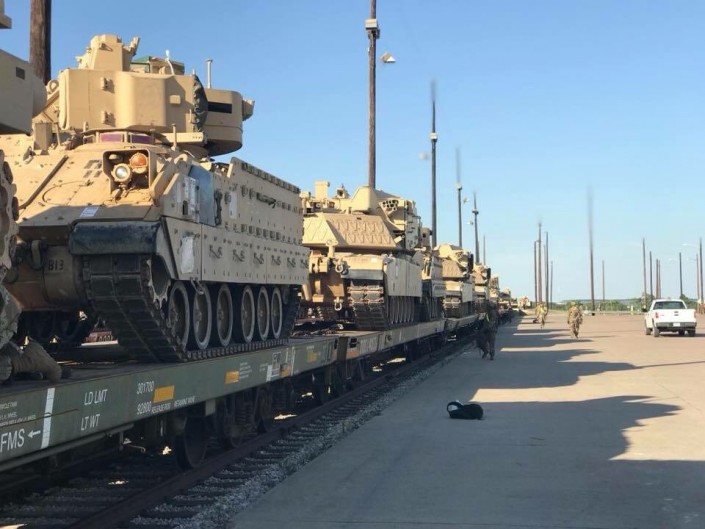 Фотографии и видео, на которых запечатлен поезд, загруженный американскими танками и направляющийся в сторону Польши, опубликованы в Twitter на странице первой кавалерийской дивизии, расквартированной в Форт-Худе.