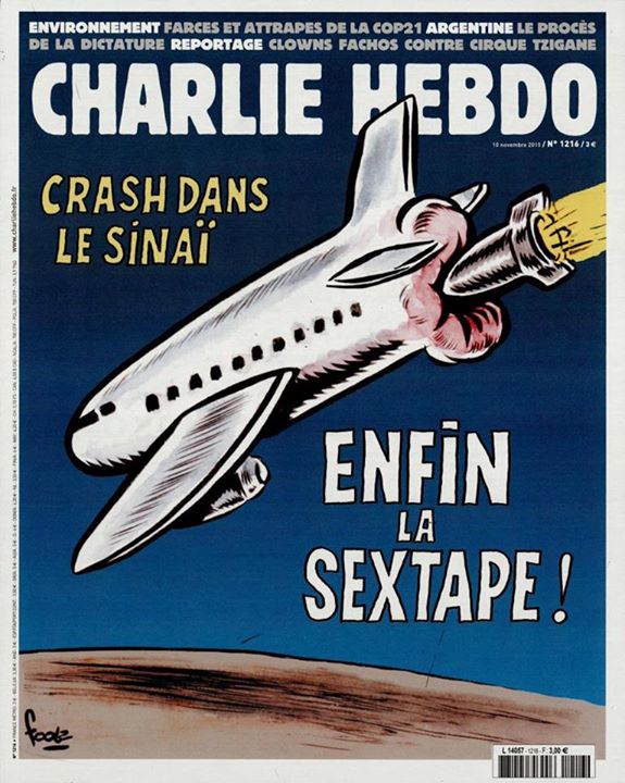 На этот раз издание разместило глумливое изображение прямо на обложку. Номер датирован 10 ноября. На карикатуре изображен падающий самолет, в хвостовую часть которого влетает ракета. Надпись над лайнером гласит: "Крушение над Синаем". Под падающим самолетом написано: "Наконец-то порно!"