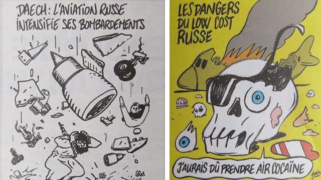 В начале ноября Charlie Hebdo публиковало карикатуры на крушение Airbus-А321 над Синайским полуостровом. Это вызвало волну негодования в России. На одной из карикатур, размещенной в журнале, были изображены летящие тела и обломки самолета, которые падают на голову террориста. Подпись в Charlie Hebdo гласила: "Российская авиация усилила свои бомбардировки". На второй - череп с подписью: "Следовало бы лететь на Air cocaine". Также журналисты написали, что, сбив самолет, террористы добыли 224 порции бесплатной еды. Российские депутаты назвали публикацию карикатур глумлением над памятью жертв трагедии.