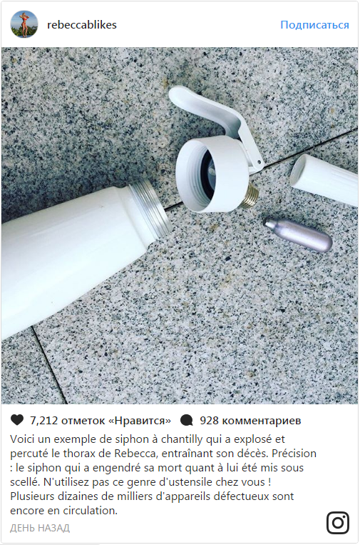 Также родные Ребекки опубликовали фотографии взорвавшегося сифона и сообщили, что удар пришелся в грудь, вызвав остановку сердца. Они также призвали держаться подальше от такого рода баллончиков.