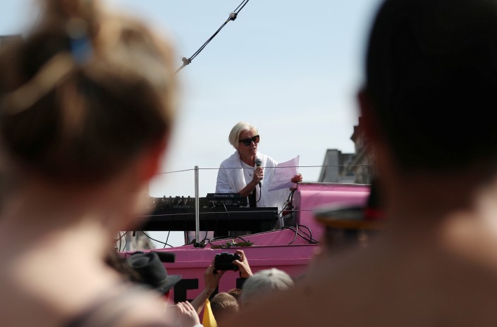 Эмма Томпсон и другие актеры читали стихи, восхваляющие щедрость Земли. Активисты сформировали вокруг лодки человеческую цепь, мешая полиции прервать акцию.