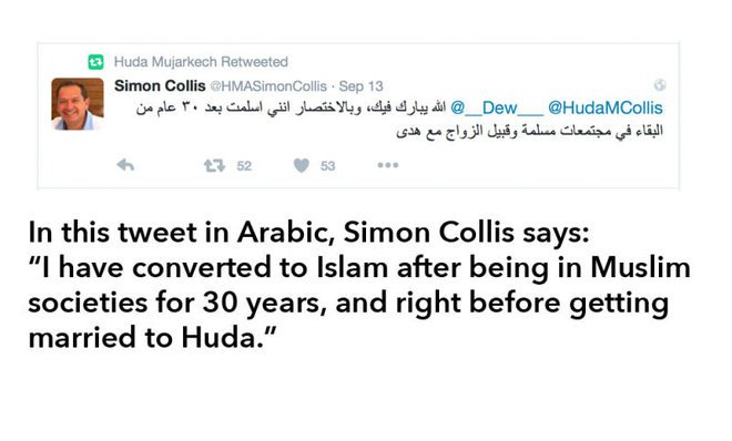 60-летний Саймон Коллис признался, что решил принять другую религию после того, как 30 лет прожил в мусульманском обществе. "Это произошло незадолго до того, как я женился на Худе - сирийской женщине", - написал дипломат в Twitter.