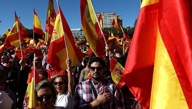 Отметим, сегодня тысячи жителей Мадрида собрались на площади Колумба в центре столицы на манифестацию в поддержку единой Испании. Большинство митингующих принесли с собой испанские флаги. Они скандировали лозунги в поддержку единства Испании и за силу конституции. Акция проходила мирно.