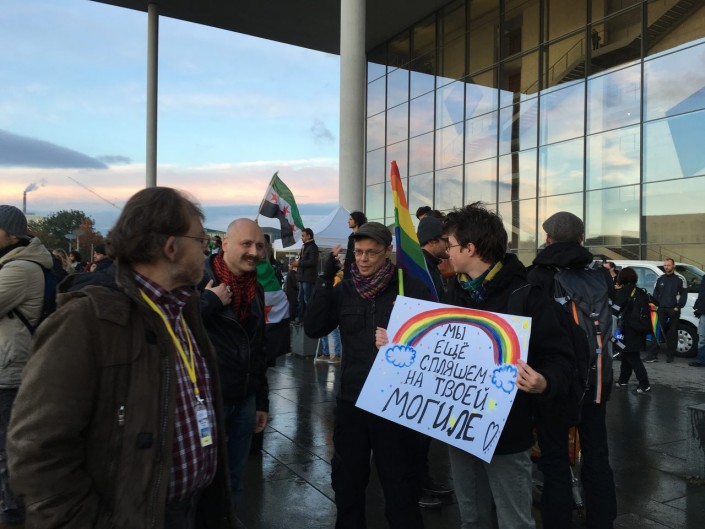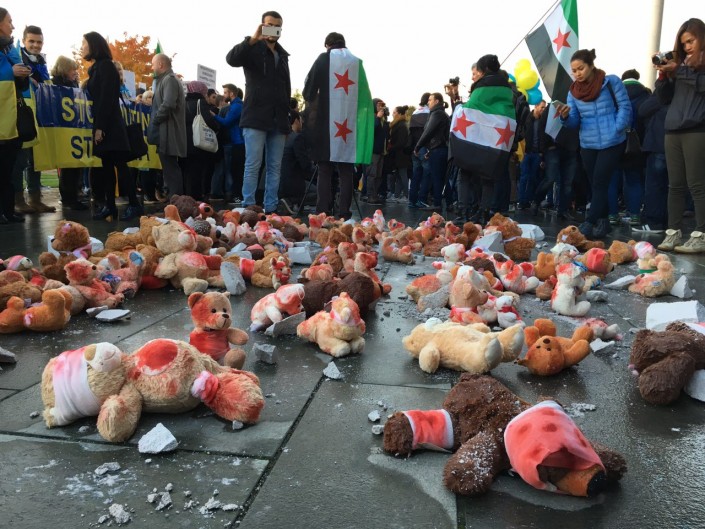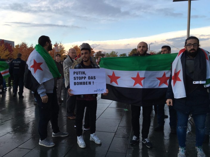 Президента России Владимира Путина, прилетевшего вечером 19 октября в Берлин на "Нормандские переговоры", встретила группа протестующих с украинскими и сирийскими флагами. В руках они держали плакаты: "Путин, хватит бомбить Сирию", "Стоп, Путин", "Путин-террорист". Об этом сообщает Tengrinews.kz.