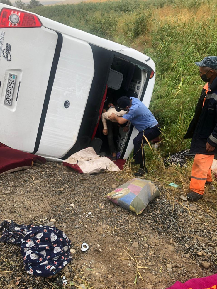 Авария произошла в 6.30 на 649-м километре трассы Алматы - Ташкент - Термез. Перевернулся пассажирский автобус ,который ехал из Алматы в Сарыағаш. Полицейские и сотрудники ЧС помогли выбраться пассажирам из салона, оказали им на месте психологическую и другую необходимую поддержку. Отмечается, что транспорт недавно прошел капитальный ремонт.