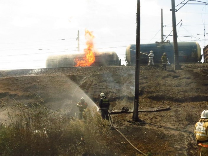 "Сегодня в 12.53 в Шымкенте на железнодорожной станции "Коргасын" произошло опрокидывание одной цистерны с ГСМ (емкость 60 тонн) грузового состава сообщением станция Бейнеу - станция Асса с последующим возгоранием. Рядом находилась еще одна цистерна с ГСМ такой же емкости, которую пожарные охлаждали, подавая воду, для предотвращения взрыва. На время работы огнеборцев сотрудниками полиции было эвакуировано 125 жителей из близ расположенных частных жилых домов", - сообщили в комитете.