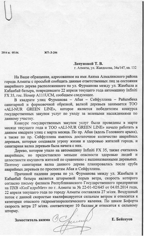 "Дерево, упавшее на машину Лепуновой, считалось аварийным наряду с другими деревьями по проспектам Абая и Сейфуллина. Однако упавшее дерево представляло меньше опасности здоровью людей. Поэтому санитарная валка планировалась после сруба других аварийных деревьев", - заявил заместитель акима Алмалинского района Ермек Бейсеуов.