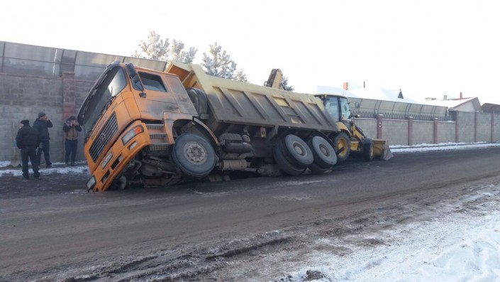 Житель Алматы снял видео, на котором из провалившегося в асфальт грузовика высыпают щебень. Ролик он предоставил редакции Tengrinews.kz. Инцидент произошел в районе 157 школы в Калкамане утром 18 января.