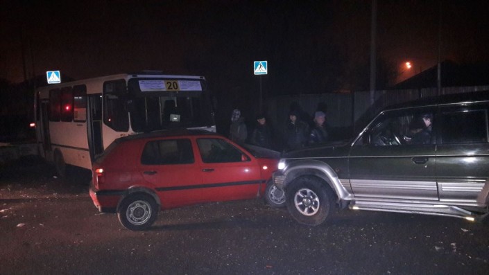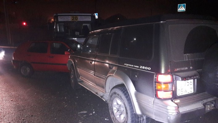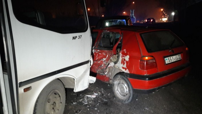 ДТП произошло вечером 10 января в районе пересечения улиц Бокейханова и Серикова. По словам очевидцев, Golf и автобус маршрута № 20 двигались по Бокейханова в северном направлении и поворачивали на Серикова налево. В этот момент якобы водитель Volkswagen решил резко перестроиться из второго в первый ряд. В результате данного маневра Golf врезался в Mitsubishi Pajero, после чего обе машины развернуло. В этот момент в Volkswagen врезается маршрутный автобус. В результате ДТП водителя Golf госпитализировали.