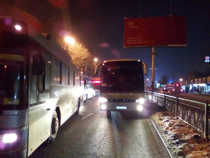 По проспекту Абая в Алматы в западном направлении, между улицами Байтурсынова и Шарипова, столкнулись автобус № 118 и троллейбус № 5, передает корреспондент Tengrinews.kz. Как рассказали очевидцы, столкнувшийся общественный транспорт занял две полосы проезжей части.
