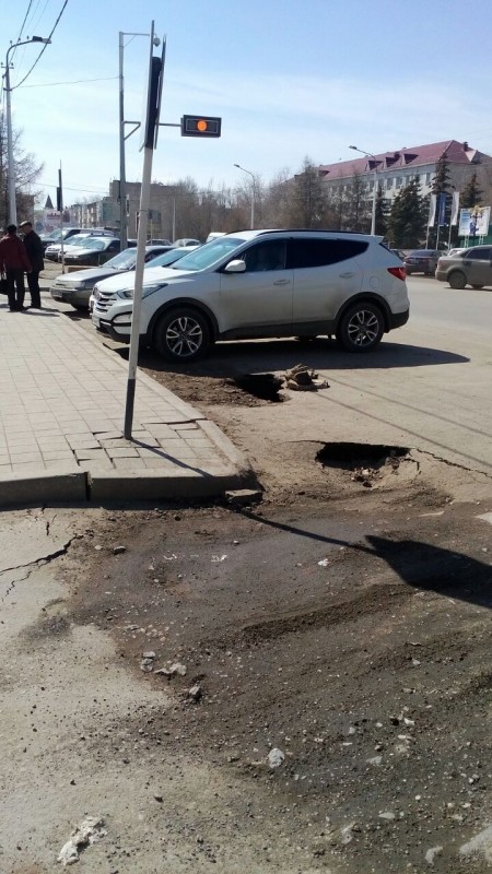 "Мы с супругом подъехали к ТД "Азия". Когда вышли из автомобиля, заметили, что асфальт под правым передним колесом начинает трескаться. Получилась такая картина: колесо провалилось, свободно вращалось в этой яме, машина зависла на бампере, левое заднее колесо повисло в воздухе", - рассказала жена велосипедиста Надежда Головащенко.