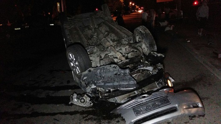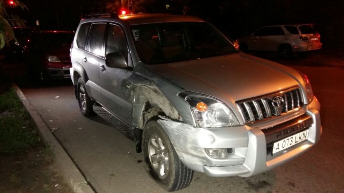 Тем временем по улице Карасай-батыра в западном направлении на высокой скорости двигалось авто марки Toyota Camry. Автомобиль проехал перекресток на красный сигнал светофора. В этот момент по улице Жарокова на юг ехал Mercedes-Benz. Он ударил Camry, которая по инерции "отлетела" в Prado и перевернулась.