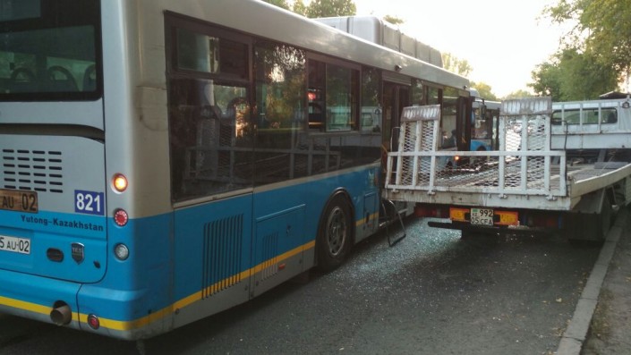 Автобус столкнулся с эвакуатором в Алматы, передает корреспондент программы "Территория происшествий" на канале СТВ.