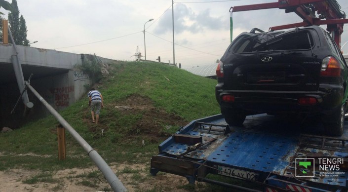 В Алматы автомобиль Hyundai Santa Fe вылетел с моста развязки, передает корреспондент Tengrinews.kz. ДТП произошло на улице Саина утром 4 июля около 7.00.