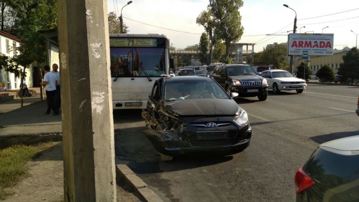 В Алматы автомобиль марки Hyundai врезался в стоящий возле остановки автобус 71-го маршрута, сообщает корреспондент программы "Территория происшествий" на канале СТВ.