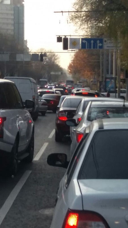 Корреспондент программы "Территория происшествий" на СТВ выяснил, что на Абая-Масанчи в пробке стояли три троллейбуса маршрута №9. Как рассказала пассажирка первого, они не трогались с места около 30 минут.