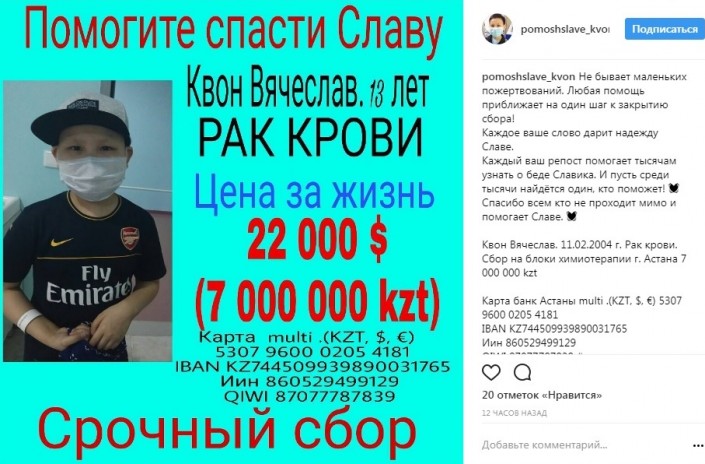 Теперь на сеансы противораковой терапии мальчику требуется крупная сумма денег. По словам родных, каждый блок облучения обходится около 1,4 миллиона тенге. Таких средств у его родителей нет. Родные открыли сбор средств.