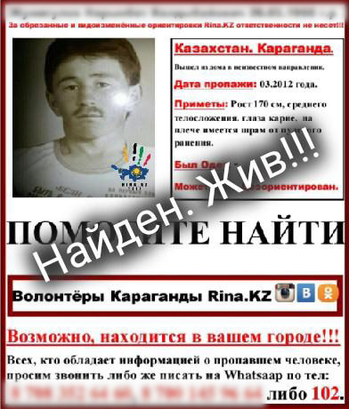"В марте этого года к нам обратились родственники пропавшего с просьбой разместить ориентировку. Через некоторое время им позвонили и рассказали, что видели похожего человека в Жанааркинском районе", - говорит основатель движения Rina.kz Ирина Шин.