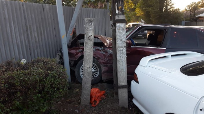 На перекрестке произошло столкновение машин. От удара оба авто откинуло на тротуар. BMW снес опору газовой трубы и влетел в забор частного жилого дома.