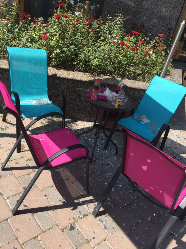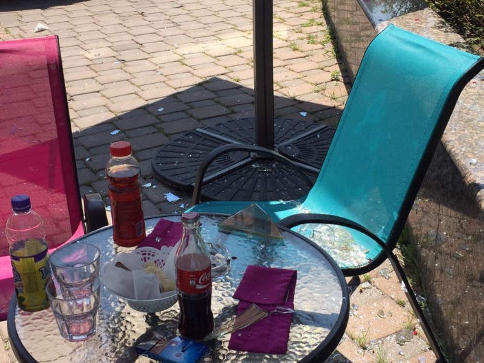 По ее словам, стекло упало целиком и приземлилось на столбик, который находился прямо возле столика, где они сидели: "Первой удар приняла девушка, которая и пострадала больше всех. Осколки вонзились ей в шею, голову, спину, на нас потом уже. Еще чуть-чуть и стекло просто убило бы ее, прорезало бы насквозь. Потому что оно летело целиком и с высоты по диагонали".