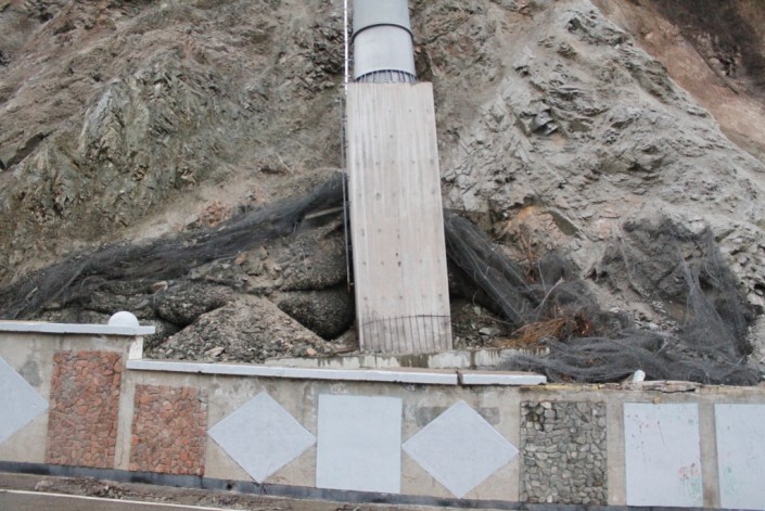 Разрушенные камнепадом заградительные металлические сети.