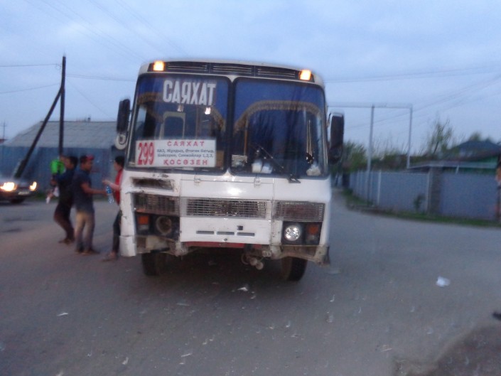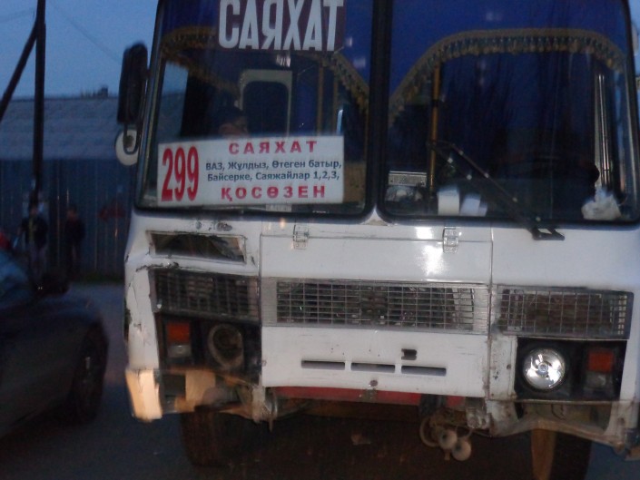 Столкнулись автобус №299, ехавший с пассажирами из Илийского района, и черный Mitsubishi. По предварительным данным, автобус ехал в южном направлении в сторону автовокзала, а японская иномарка - в западном направлении. На перекрестке, где случилось столкновение, отсутствует светофор, и оба водителя не уступили друг другу дорогу.