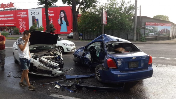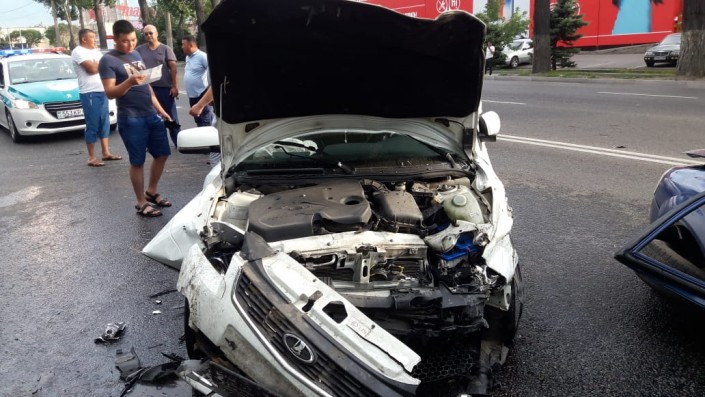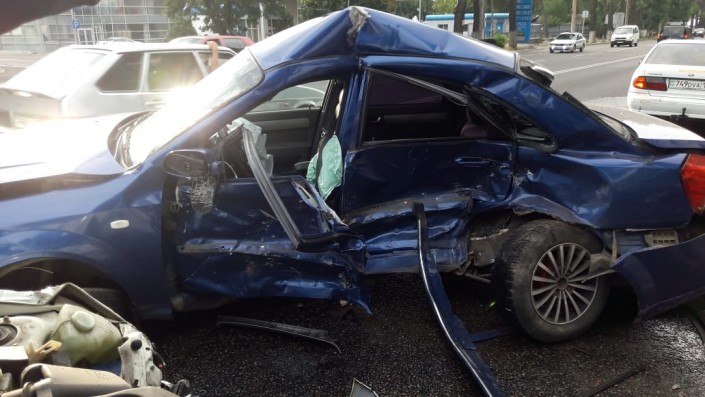 Серьезная авария произошла по проспекту Суюнбая ниже проспекта Райымбека. По предварительной версии, водитель Chevrolet двигался в южном направлении по Суюнбая и из-за дождя не справился с управлением, так как дорога была скользкая. Машину занесло и она вылетела на полосу встречного движения боком, допустив столкновение с автомашиной Lada Priora, которая в этот момент двигалась в северном направлении по Суюнбая.