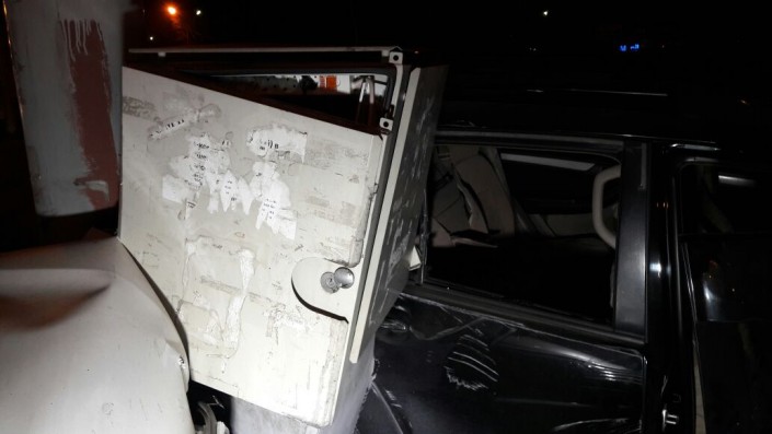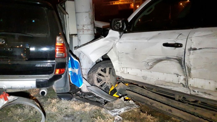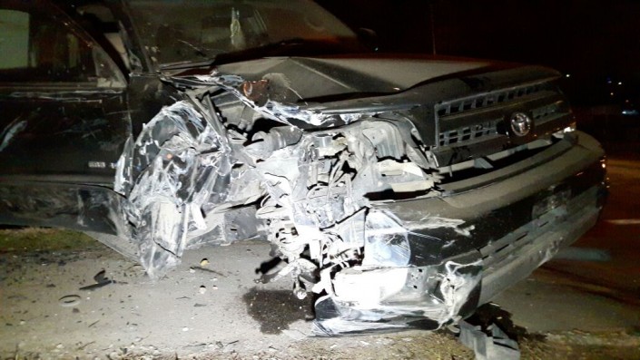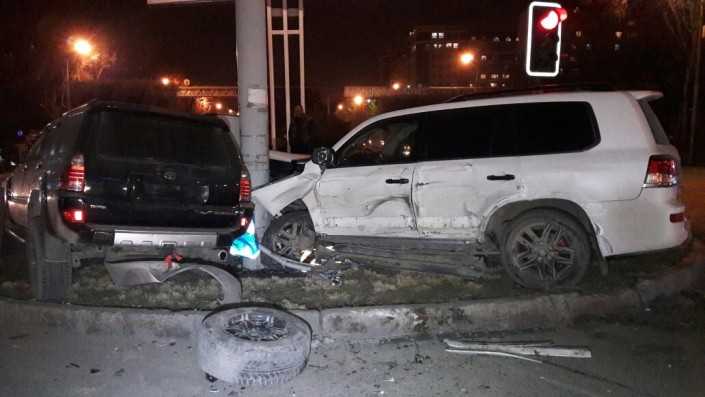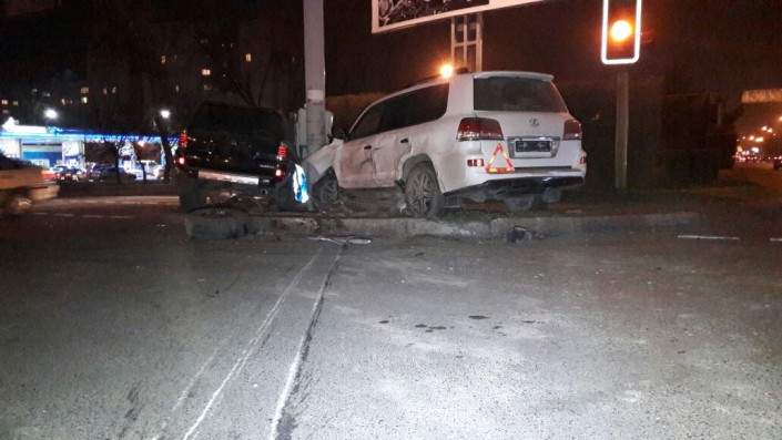 По другой версии, Lexus собирался поворачивать с Толе би на Яссауи, однако в него на полном ходу врезалась Toyota 4Runner.