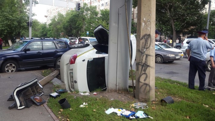 От удара такси закрутило, оно задело Subaru Forester, после чего снесло светофор и опрокинулось в арык.