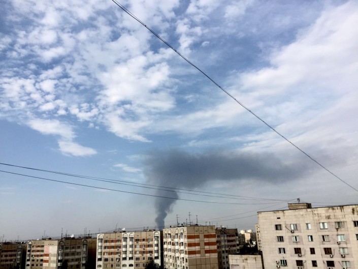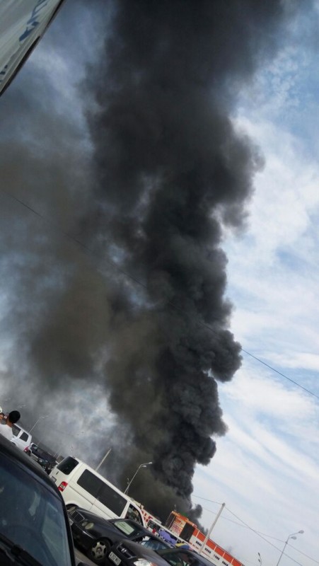 По информации корреспондента, предположительно, горят склады с обувью. Местные торговцы спешно выносят товар из уцелевших складов. На место также прибыли солдаты Нацгвардии.