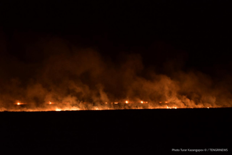 В тушении пожара принимают участие сотрудники ДЧС и работники и ДПФ ТОО "Куат" , а также несколько единиц техники с обеих сторон.