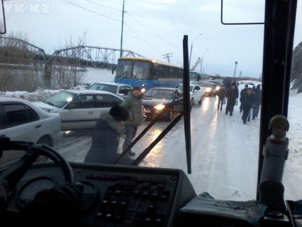 Между тем, в городе образовалась одна из самых протяженных автобусных пробок за последние несколько лет. Из-за скользкой трассы общественный транспорт застрял на льду. Огромная пробка в несколько сотен метров растянулась на проспекте в районе Левобережья. Около двух десятков автобусов встали один за другим, будучи не в состоянии двигаться на небольшой пригорок из-за чрезвычайно скользкой трассы. Сотни горожан опоздали на работу. В ситуацию уже вмешались местные власти.