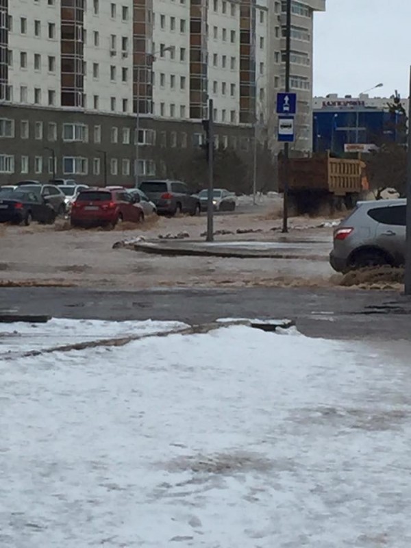 Авария произошла на левом берегу на пересечении улиц Сауран-Сыганак. Буквально за несколько минут вода затопила проезжую часть и затруднила движение на улице.