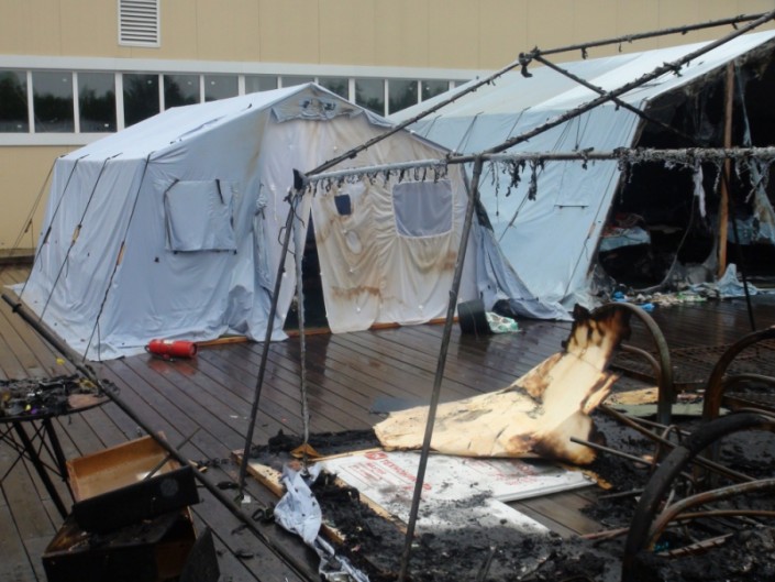 "Он спал и не слышал, чтобы их будили! Ему стало жарко, проснулся, повернулся направо — и вся стена в огне была, весь потолок в огне! Он встал и побежал будить всех и кричать: "Пожар! Вставайте!" Выбежали они в чем спали, босиком! Сгорели все вещи и телефон. Час стояли на улице, потом их куда-то впустили. Он позвонил мне в 04.00 где-то и сказал, что "у нас пожар, палатки сгорели, приезжай за мной!" Мы и выехали".