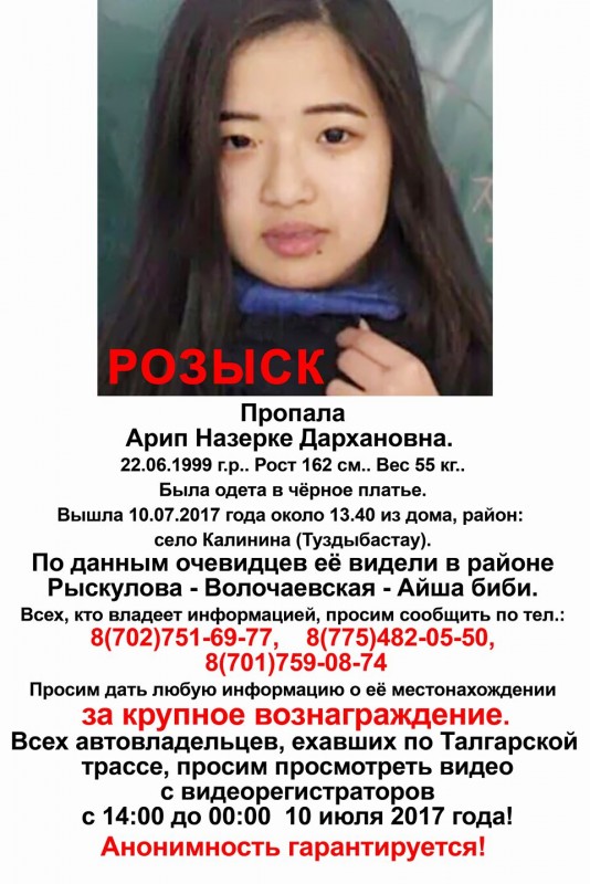 Напомним, Назерке Арип вышла из дома днем 10 июля в поселке Туздыбастау (Талгарский район). Рост 162 сантиметра, вес 55 килограммов. Была одета в черное платье. Волосы длинные черные. На следующий день через мобильный телефон девушки был отслежен путь ее передвижения. По данным детализации номера телефона было выявлено, что ее мобильный телефон в последний раз был зафиксирован в районе улиц Гурилева - Татибекова - Рыскулова - Айша биби.