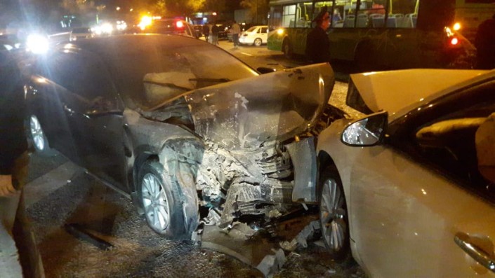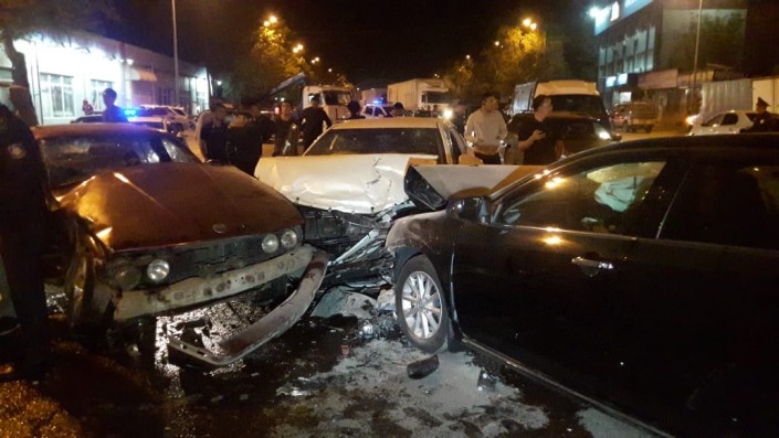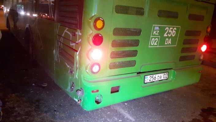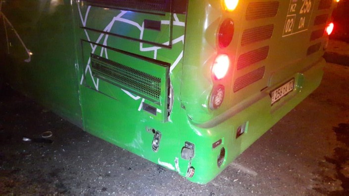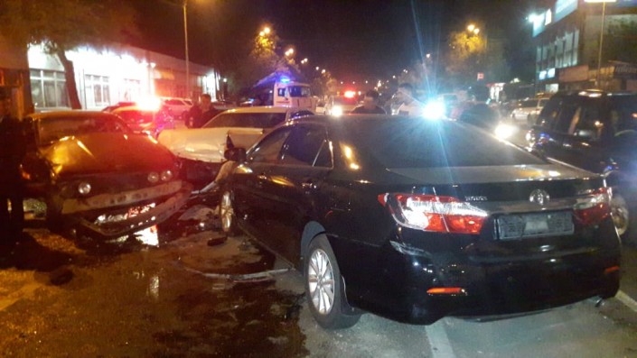 По словам очевидцев, черная Toyota Camry двигалась по Рыскулова в западном направлении и выехала на встречку, где столкнулась с белой Toyota Camry. Затем "японец" ударяет BMW, который по инерции откидывает на Toyota Yaris. Последняя врезается в пассажирский автобус.