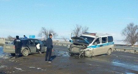 По данным полиции, авария произошла в воскресенье 27 декабря на 212-м километре автодороги Алматы - Ташкент. Как оказалось, 46-летний водитель легкового автомобиля Mercedes двигался со стороны села Кордай в Алматы. "В результате обгона впереди движущейся автомашины, не убедившись в безопасности маневрирования, он совершил столкновение с автомашиной Hyundai Н-1, то есть полицейским "Автоураганом", - говорится в сообщении.
